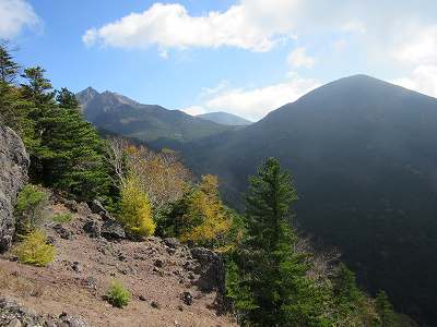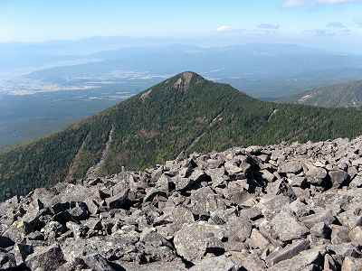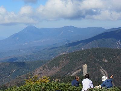 北八ヶ岳 北八ツ方面も晴れました。 蓼科山(左)や北橫岳がきれいに見えます。 その他、御嶽山はもちろん、穂高岳や槍ヶ岳など北アルプスも遠望できますがきりがありません。 そろそろ下山しますか。 |