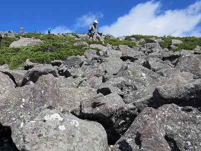 岩ゴロを下る 編笠山からは岩ゴロ下りです。 矢印や丸印が岩に書かれているので、それを追って下ることになります。 〔編笠山 発=12:50〕 |