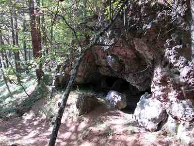 臼久岩小屋 どのあたりまで下ってきただろうかと、途中で何度もGPSで確認してしまいました。 そしてようやく臼久保石小屋に着きました。 かつての修験者やまたぎが使った巨大な岩屋だそうです。 〔臼久岩小屋=14:10~14:15〕 |