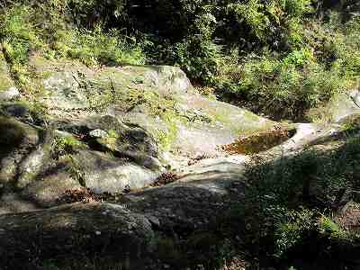 盃流し 岩小屋から盃流しまでは20分ほどでした。 盃流しは中央部がくぼんで雨樋のようになった一枚岩で、滑滝のように沢の水が 流れ下るところです。 残念ながらこのとき水は流れていませんでした。 平安時代の貴族が庭園の曲がりくねった川(遣水)のほとりに座り、上流からお酒の入った盃を流す。〔盃流し=14:35~14:40〕 |