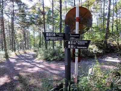 登山口から20分弱歩いたでしょうか、五叉路分岐に出ました。 ここから上動清水へは左の林道を歩いて行きます。 編笠山からの帰りは正面の登山道を下ってこの五叉路に戻ってくることになるようです。 〔五叉路分岐=7:40〕 |