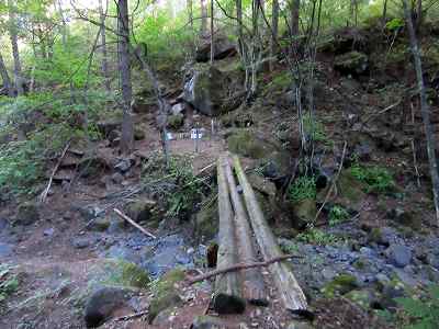 なにげなくこの丸太橋を渡ってしまいました。 ところが渡った先に、『老朽化に付き通行禁止 迂回してください』 という看板があったのです。 知らぬが仏とはこのことか。落下しなくて助かりました。帰りはちゃんと迂回しましたよ。 |