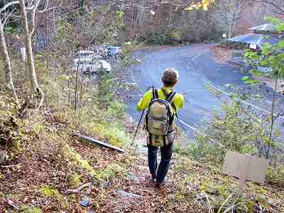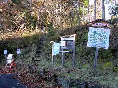 野鳥の森登山口 好天の土曜日だからでしょう、野鳥の森に着くとすでに先客の車が1台あり、われわれに続いて2台 やってきました。 登山届けを書き、ポストに入れて出発です。 いきなり急登でした。 〔登山口 発=7:45〕 |
