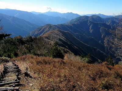 ここまで登ってきた尾根 崩壊地の上まで登ってくると南から南西側の眺望が開けました。 この尾根をたどって登ってきたことになります。 |