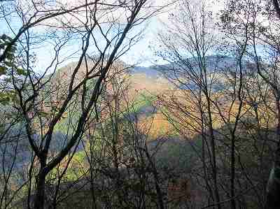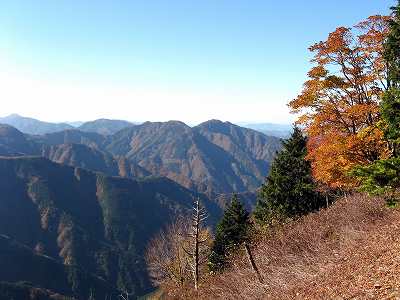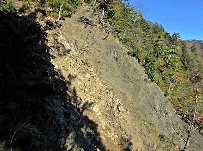 崩壊展望地 崩壊地上の展望地まで戻ってきました。 小春日和の展望地の日だまりで、景色を楽しみながら小休憩します。 こうして見下ろすと赤く色づいて見える尾根が一番紅葉しているようです。 〔崩壊展望地=13:25~13:35〕 |