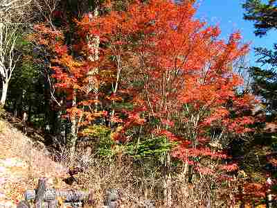 鮮やかな紅葉 この展望地には真っ赤に色づいたモミジの木がありました。 柔らかな日を浴びてひときわ鮮やかな紅葉です。 〔崩壊地・展望地 発=9:35〕 |