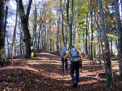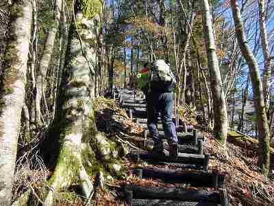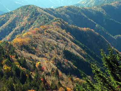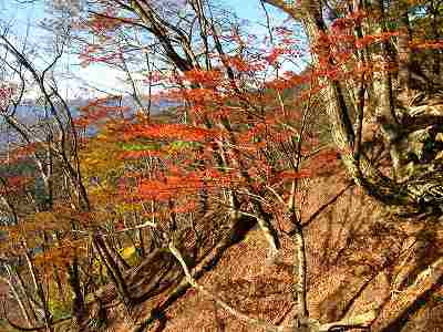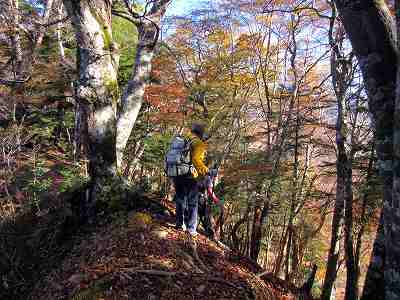 基本的にこのコースは尾根筋を登って行きます。 やせ尾根や幅の広い尾根の部分もありますが、樹木に赤ペンキでマーキングされているので 道迷いの心配はありません。 自然の色合いの紅葉がずっと続いていました。 |