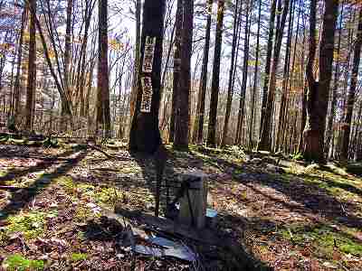 崩壊地から登ること20分、平坦になった左手に麻布神社奥宮跡がありました。 昔あった拝殿は昭和39年の台風で大破。その後諸般の事情で再建できず前社に遷座合祀することになった。 本所霊地には石碑を建て、時期をみて本宮の再建を願っているという。〔麻布神社奥宮跡=9:55~10:00〕 |