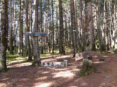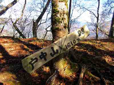 戸中山(1,610m) 麻布山から20分、戸中山(とちゅうやま)に着きました。 山頂標識のあるこの場所は眺望はありません。しかし、すぐ先50mほどのところが展望地になっていました。 〔戸中山 着=10:40〕 |