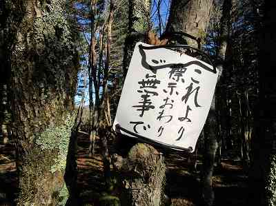 麻布山山頂で休憩して前黒法師山へ向かいます。 山頂から少し行ったところに休憩舎・山頂東屋がありました。 そこから前黒法師山への登山道入口に、『これより標示おわり ご無事で』 とあります。 気をつけて参りましょう。 |