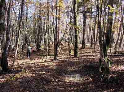 広い尾根道 麻布山から前黒法師山へも尾根道です。 ぬた場のある広い尾根もあります。確かに麻布山までのような標示はありません。 それでも所々には赤テープがありました。 基本的に尾根を外さずに行けばいいですが、GPSを持っていると安心です。 |