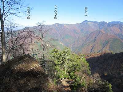 戸中山展望地からの眺望(1) 展望地からは北側の眺望が広がっていました。 この写真は北西から北を見たところで、奈良代山(1,624m)、シャウヅ山(栃生山 1,835m)、 その先に黒沢山(2,123m)が見えます。 また、この山並の左奥遠くに雪で白くなった御嶽山や中央アルプスも見えていました。 |