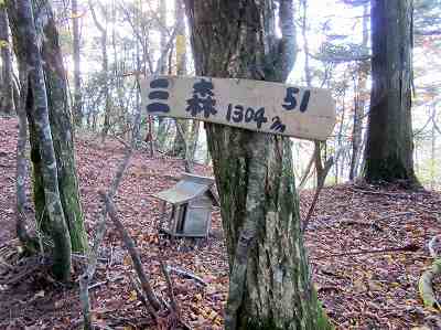 三森(1,304m) 登ること10分、小さな祠がありました。最初のピーク三森です。 実は、この写真は帰りに撮ったものです。 行きには祠は見ましたが 《三森》 の山標は気づかずに通り過ぎてしまったのです。 〔三森=7:55〕 |