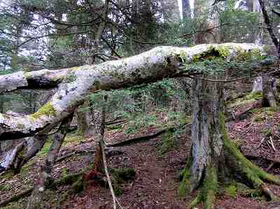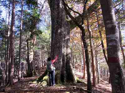 かなり歩いてきたなあと思うころ巨木が現われました。 ミズナラのようです。 帰りに3人で手をつないで測ってみたら、幹の太さは約5.2mありました。 〔ミズナラの巨木=9:05〕 |