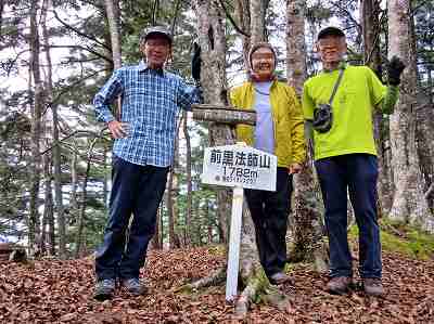 前黒法師山山頂(1,782m) 眺望もないし、まだかまだかと思いながら登ってきました。そしていくつかのニセピークに がっかりしながらようやく、前黒法師山山頂まで登ってきました。 あとから男性1人が登ってきて、やはり道がわかりにくかったといっていました。 記念写真を撮り、ゆっくり昼食を味わった後下山にかかります。 〔前黒法師山=11:30~12:05〕 |