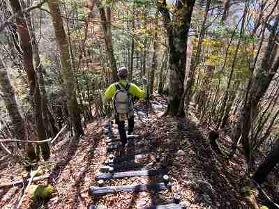 登山道 戸中山から先は針葉樹が多く、紅葉はほとんどありませんでした。 そしてなかなかの急登の道でした。踏み跡も薄く赤テープも少ないので進行方向を見定めながら 登ります。 |