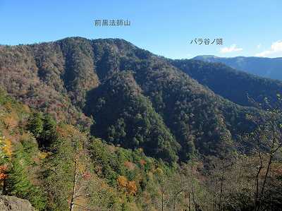 崩壊したおかげで展望地になっています。 ここまでほとんど眺望がなかったのですが、東側にこれから行く前黒法師山、 遠くにバラ谷ノ頭(2,010m)が眺望できました。 |