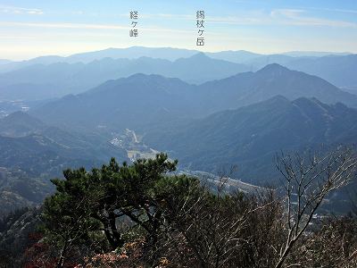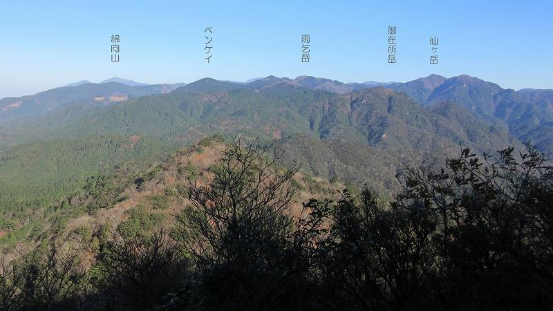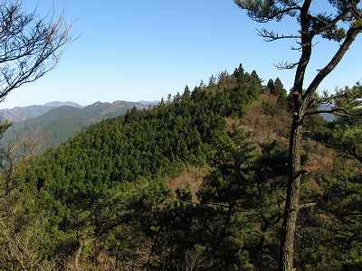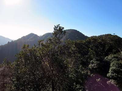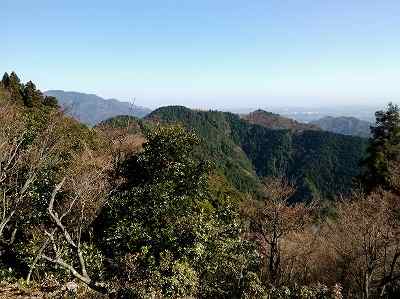 ここまで歩いてきた稜線 北側にはここまで歩いてきた稜線が見えます。 中央の山が霧ヶ岳で、 左奥に見えている山は野登山(852m)になります。 |