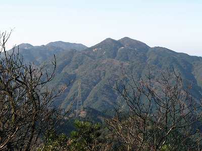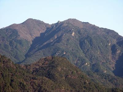 仙ヶ岳のズームアップ 霧ヶ岳の肩からみえていた山の中から仙ヶ岳をズームアップしてみました。 双耳峰の仙ヶ岳は左の西峰(961m)が主峰で、右の東峰(955m)には巨岩・仙の石があります。 〔霧ヶ岳の肩 発=9:35〕 |