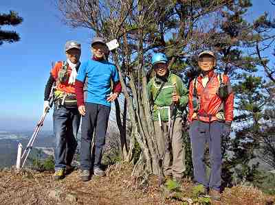 本峰である北峰で登頂記念の写真を撮るのを忘れてしまったことに気づきました。まずは4人で一緒に 記念撮影です。 背後の遠く西方に琵琶湖が霞んで見えていました。 〔四方草山南峰山頂 着=10:25〕 |