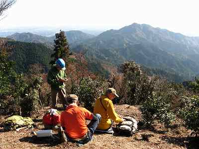 景色を見ながらゆっくり昼食 天気はいいし、暖かくて気持ちのいい山頂です。 景色を楽しみながら昼食をとり、ついつい40分ものんびり過ごしてしまいました。 右の山は明星ヶ岳です。 さて、ここで行程の約半分です。このあと三子山へ向かったのですがトラブルが待っていたのです。 〔四方草山南峰山頂 着=10:25〕 |
