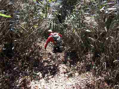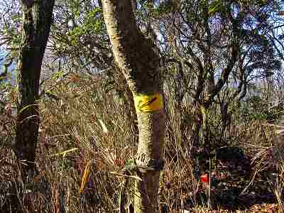 黄色いテープの矢印分岐 道迷いが多いと聞いていたのでネットでいろいろ調べてきました。 その中に、『黄色のテープは間違い、注意!』 というのがいくつかあったのです。 その思い込みから、この分岐が間違いだと思って直進したのがトラブルでした。 途中でGPSで確認して戻ったのですが20分のタイムロスをしてしまいました。 〔黄色いテープの矢印分岐=タイムロス11:10~11:30〕 |