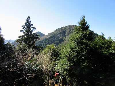 前方に三子山が見えてくる しばらく下って行くと、前方に三子山が姿を見せます。 左が三子山Ⅱ 峰、右が三子山Ⅰ 峰(北峰)です。 |