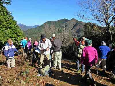 登山者でいっぱい三子山Ⅰ 峰山頂(568m) 三子山へ登っていくと人の声が聞こえてきました。 登り着いてビックリ、20人くらいのグループ登山者であふれていたのです。くつろぐ場所もありません。 写真は北を見たところで、中央の双耳峰のように見える左のピークが四方草山の北峰、右が南峰です。 〔三子山Ⅰ 峰山頂 着=12:15〕 |