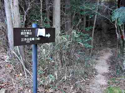 四方草山・三子山方面への登山口は道の反対側(東側)にありました。 ここからいきなり急登が始まります。 〔安楽峠登山口 発=8:00〕 |
