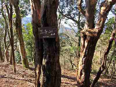 三子山Ⅱ 峰山頂(556m) 下って登って約10分、三子山Ⅱ 峰山頂に着きました。 ここは樹木に囲まれていて眺望はありません。すぐ三子山Ⅲ 峰へ行くことにします。 〔三子山Ⅱ 峰山頂=12:35〕 |