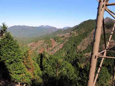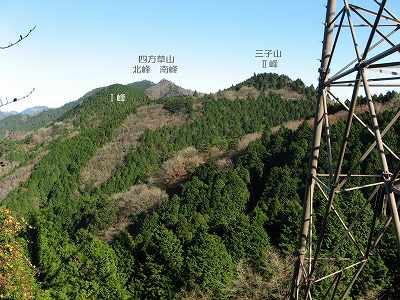 鉄塔展望地からの眺望 もう眺望は終りかと思って三子山を下ってくると送電線鉄塔がありました。展望が広がっていたのです。 四方草山や三子山のⅠ 峰からⅢ 峰が見えました。 写真ではⅢ 峰は右手の鉄塔の奥にあります。 〔鉄塔展望地 着=13:00〕 |