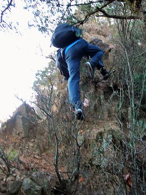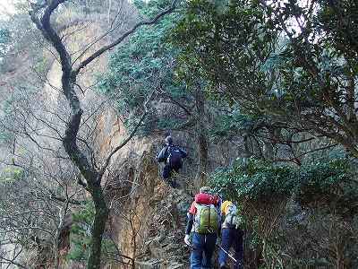 ロープ場を登る 右折して20mほど登った先は崩壊した崖でした。 その崖の縁を左へ下って行きます。 このあたりは崩壊地が続くところでしょう、7・8分行くとフィックスロープが設置された崖がありました。 |