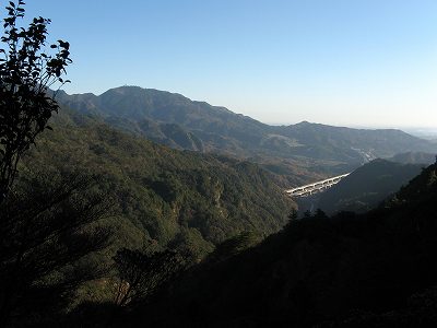 南側の眺望 南側ですが、遠くに経ヶ峰が見えます。 そして中間部に錫杖ヶ岳が姿を見せ、眼下には国道1号線が走っています。 |
