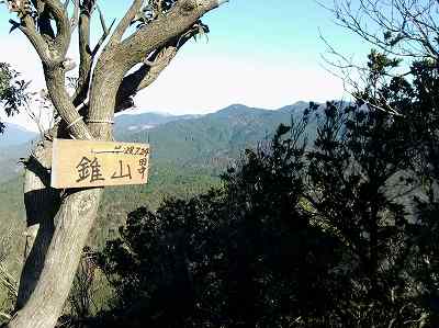 錐山山頂まで登ってきました。 眺望全開とはいきませんが、振り返ると滋賀県側の山々が見えます。 写真中央の丸い頭の山はベンケイ(762m)です。 〔錐山 着=9:10〕 |