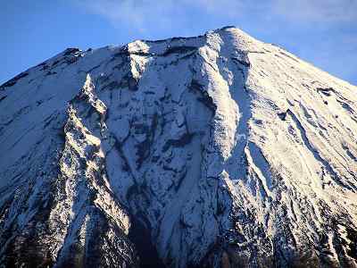 富士山山頂部と大沢崩れ 富士山山頂部をズームアップ。 長者ヶ岳から見ると大沢崩れが真正面になります。 遠くから見る優雅な姿とは違って荒々しくもあり、下の方まで大きく崩れて痛々しい感じがします。 |