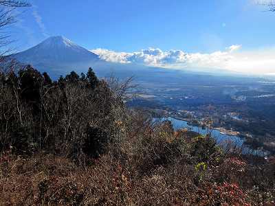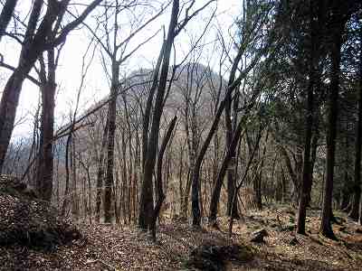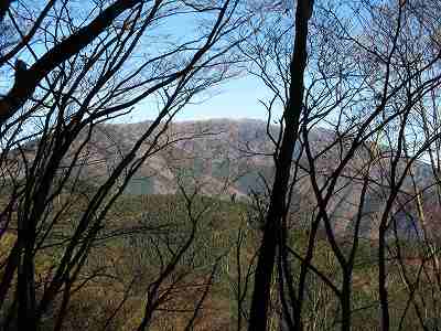 尾根道は東海自然歩道でもあり、比較的緩やかで歩きやすい登山道でした。 しばらく登って行くと右手に毛無山が見えてきました。 木の枝の間からなのですっきりとした山姿ではありませんが、山頂部は白くなっています。 雪がうっすらと積もっているのか、あるいは霧氷なのかもしれません。 |