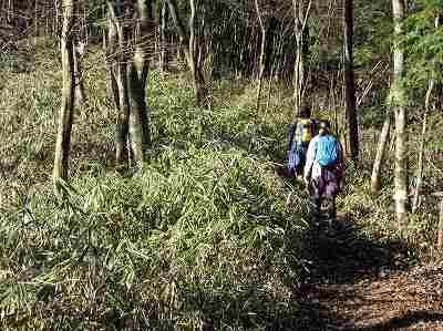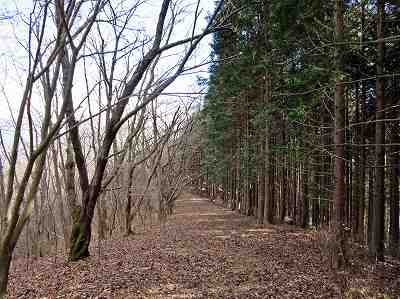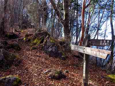はじめはヒノキ林の中、かなり登ったところからは雑木林に変わります。 冬枯れの木々の間から富士山や田貫湖が見えるとはいえ、すっきりした景色ではありませんでした。 そして登山口からひたすら登ること約40分、ようやく尾根に出て東海自然歩道と合流しました。 〔東海自然歩道出合 着=8:35〕 |