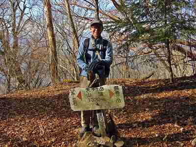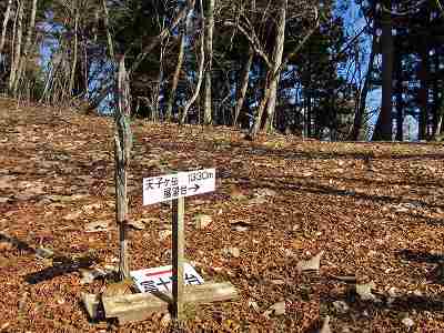天子ヶ岳山頂(1,330m) 上佐野への分岐から標高差で約130m登り返して天子ヶ岳に着きました。 ただ、国土地理院の地図、YAMAPの地図でみる最高地点には山標はありませんでした。 100mあまり南へ緩く下ったところにこの山標が設置されているのです。 〔天子ヶ岳 着=10:40〕 |