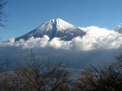 富士見台から見る富士山 東側の一部が開かれたところが富士見台でした。 そのなまえの通り、富士山を正面に望むことができます。 11時近くになりやや雲が出てきたようです。 お!、富士山もねじり鉢巻をするのかな。 日当たりのいい広場に戻ってゆっくりと昼食をとり下山にかかります。 〔天子ヶ岳 着=10:40〕 |