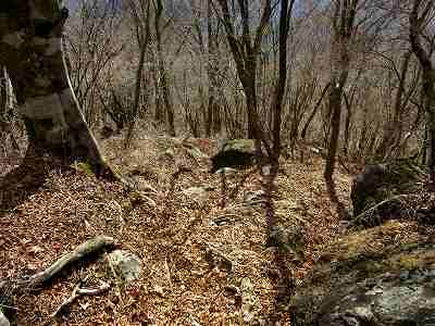 広い尾根道に変わる 私より先に下りていった女性2人が林道終点の平らな場所で昼食中でした。 本格的な山ご飯のようです。うらやましいなあ。 彼女たちとはここでお別れします。ここから先は広い尾根道に変わりました。防火帯なのかもしれません。 〔林道終点=11:40〕 |