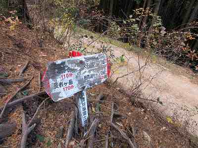 長者ヶ岳山頂から15分で天子ヶ岳との鞍部まで下りてきました。 ここは山梨県南部町の上佐野へ下る道への分岐点になっています。 〔上佐野への分岐=10:15〕 |