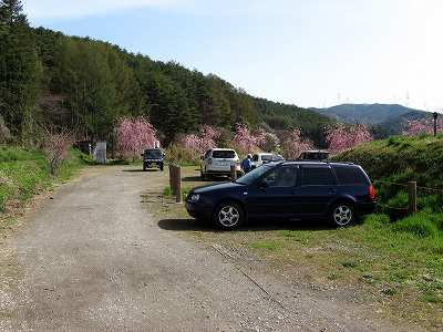 登山者用駐車場 ナビに従って走っていくとありました、登山者用駐車場。 17・8台駐められるでしょう、簡易トイレもある整備された駐車場です。 ちょうどピンク色の枝垂桜が満開でした。 |