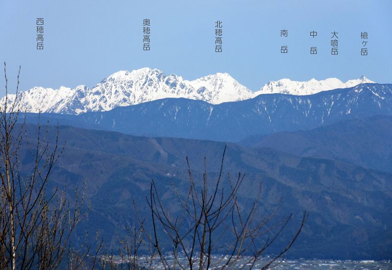 穂高・槍ヶ岳連峰 霧訪山は聞いていた通り360度眺望の山でした。 まずは北西方向に真っ白な穂高・槍ヶ岳連峰が見えます。 10日前に岐阜の小津権現山から見た時よりもだんぜんはっきりとした山の姿です。 Please permit it if mention of the name of the mountain includes an error. |