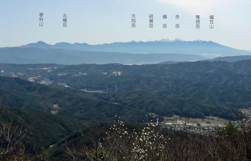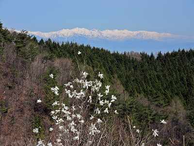 急なところもありますが歩きやすい登山道を行きます。 頂上まで400mの地点まで登ってくると北側の展望が開けていました。 白いタムシバの背後に北アルプス北部の山々が見えます。 中央やや左の高く見える山が鹿島槍ヶ岳でそのすぐ右が五竜岳。さらに右手の白い山並みは 白馬三山などです。 〔頂上まで400m展望地=9:15~9:20〕 |
