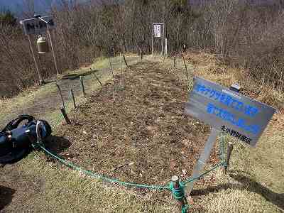 オキナグサの保護育成 360度の眺望のほか、今回霧訪山に来た目的に花があります。 中でも絶滅危惧種に指定されているオキナグサの花をぜひ見たいと思っていました。 この山頂では囲いをした中で大事に育てているようです。 |
