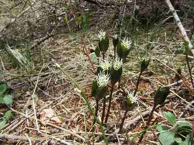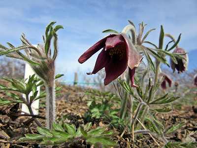 オキナグサ 初めて見ましたオキナグサ(翁草)。 まだ咲きそろってはいませんが、情報通りいくつもの株が花をつけていました。 囲いの中のほか、山頂に祀られた石祠 『會地社(おうちしゃ)』の脇に2株ほど オキナグサがありました。 |