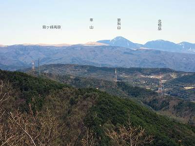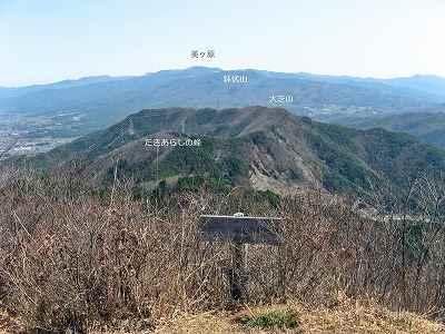 眺望写真、オキナグサの写真を撮っているうちに登ってくる人が増え、 狭い山頂にあふれるほどになってしまいました。 邪魔にもなるのでそろそろ大芝山へ向かうことにします。 大芝山の向こうには先日山岳遭難救助ヘリが墜落した鉢伏山と美ヶ原が見えます。 〔霧訪山山頂 発=9:55〕 |