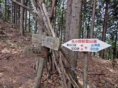 北小野登山口分岐(新道) 昼食後下山にかかります。 たきあらしの峰を過ぎ、ひと登りしたピークに北小野登山口分岐(新道)があります。 ここから大下りしていきます。 〔たきあらしの峰=11:50〕 〔北小野登山口分岐=12:10〕 |