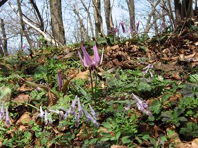 カタクリとヤマエンゴサク 大芝山の方が花が多いと聞いていたとおりカタクリ(片栗)がたくさん咲いていました。 ほかの花がなかなか見つけられなかったのですが、ようやくエンゴサク(山延胡索)に出会いました。 ヤマエンゴサクの花に囲まれたカタクリです。 |