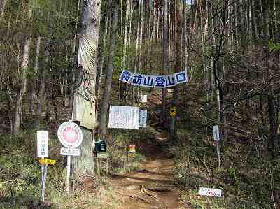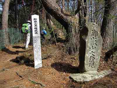 最初は階段を登っていきますがなかなかの急登でした。 御嶽山大権現まできました。ここで頂上まで1300m地点です。 この山はアカマツ林の山です。秋にはマツタケが出るようです。 そのため、登山道以外の場所に入らないように という看板などが各所に設置され、登山道沿いにロープが張ってありました。 〔御嶽山大権現=8:45〕 |